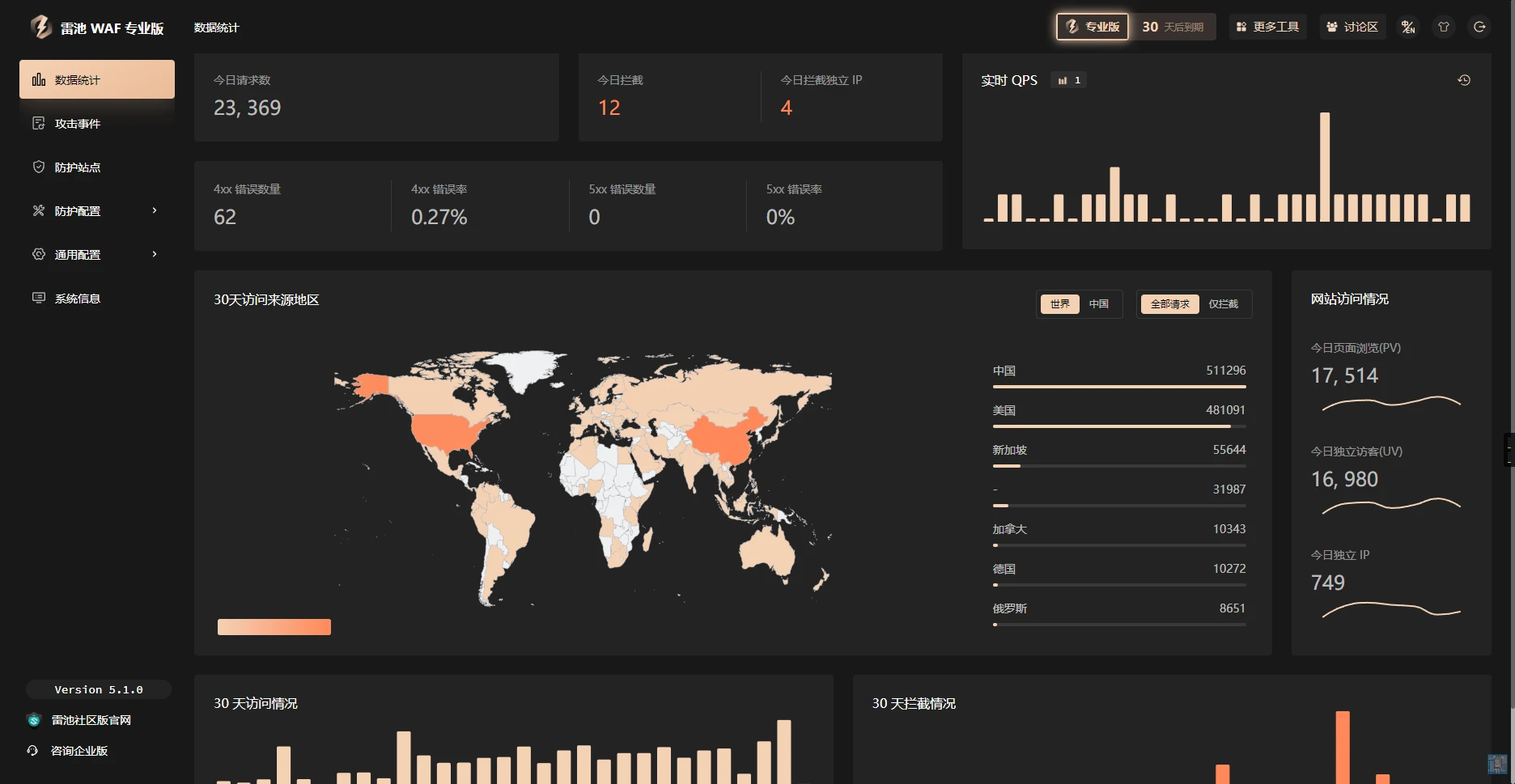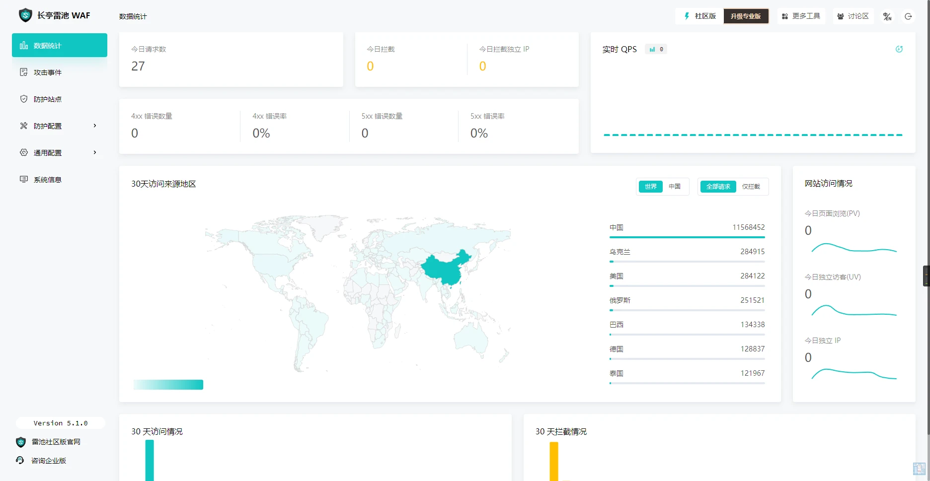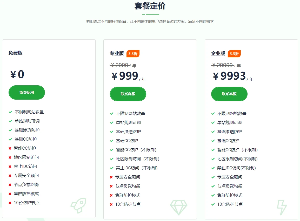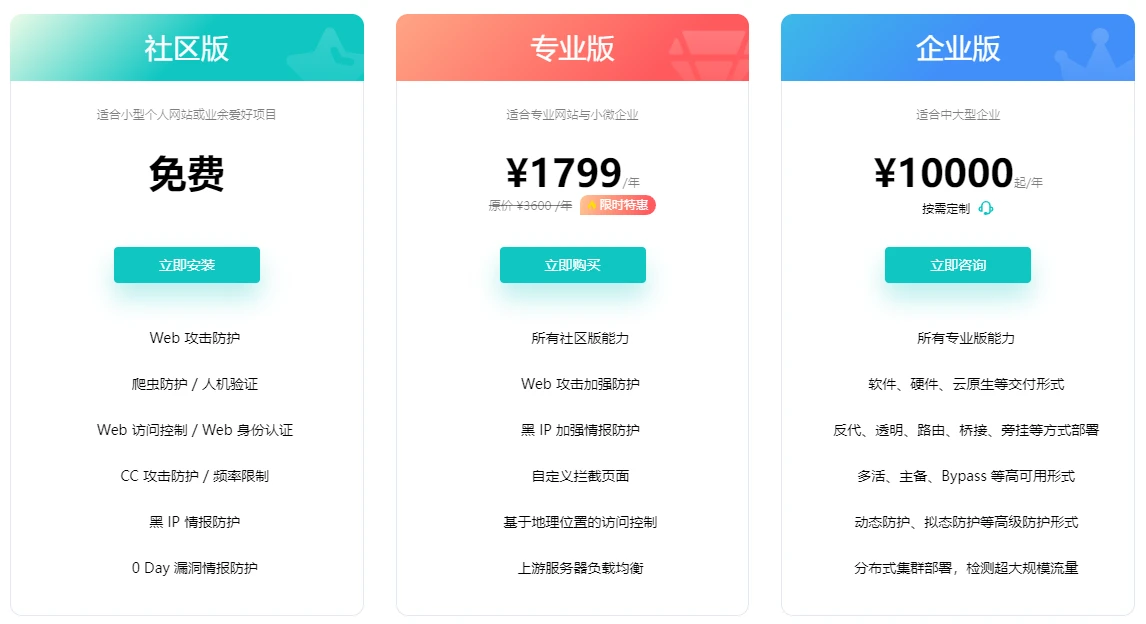 (即不响应任何内容)默认都是403,支持lua自定义负载均衡专业版支持公测期免费完全免费大屏监控无有无是否有免费版有有有专业版价格299一个月,1799一年999一年无企业版价格10000一年起9993一年价格面议雷池专业版