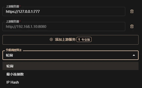 专业版支持负载均衡,算法就是最常用的轮询、最小连接数、IP 短哈希
