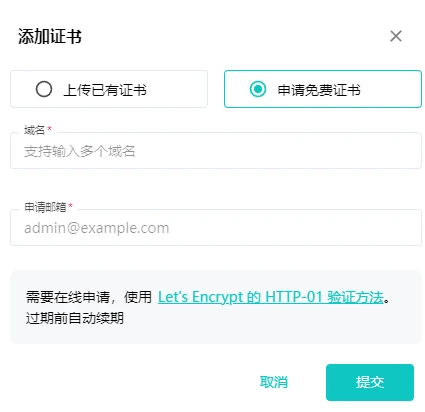 目前仅支持使用 HTTP 方式申请,并且只支持 Let's 的证书,不支持 ZeroSSL