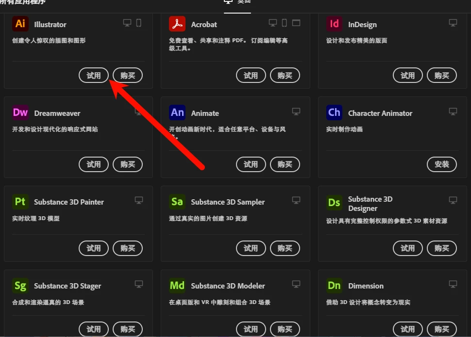 安装完成后登录你的Adobe账号,直接点击想要的应用的试用按钮