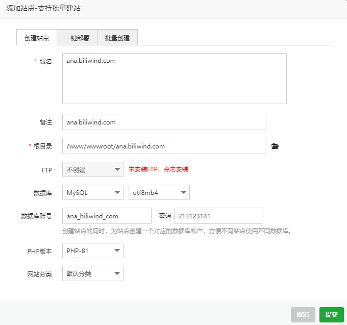 之后我们在宝塔面板里添加一个站点,域名请填你自己的,如果没用,直接填写服务器ip(也可以使用ip:port的格式)