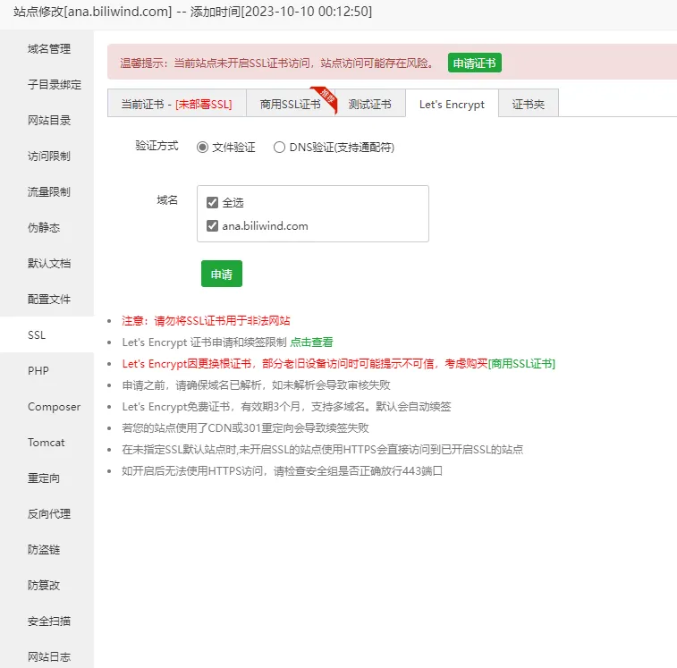 之后点击“Let‘s Encrypt”勾选域名,点击申请,之后就可以获得免费的SSL