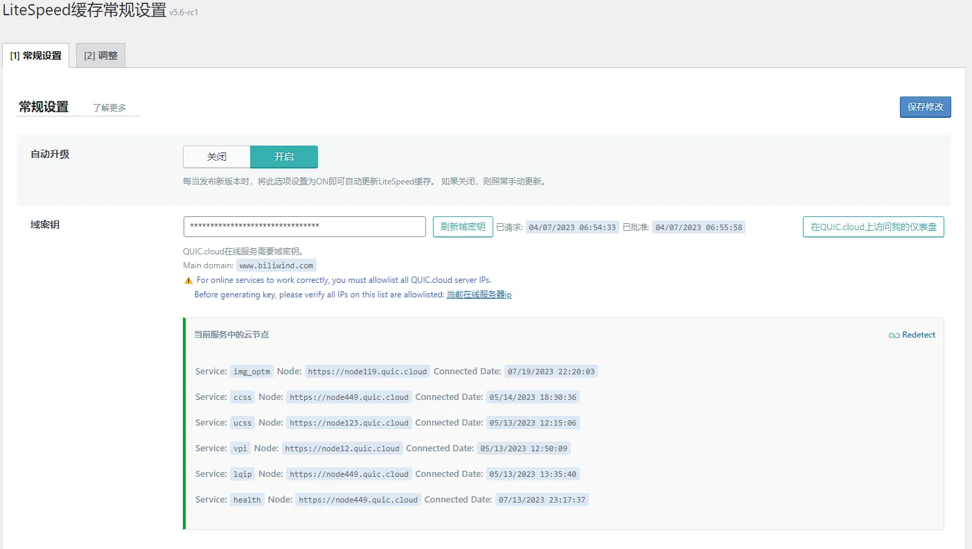 一般情况下会以15分钟请求一次的频率来向QUIC.cloud申请密钥,一旦成功便会变为下图所示: