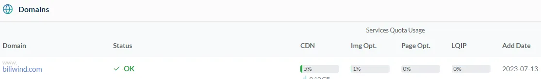 Domains一栏即为你绑定在QUIC.cloud的域名,点击域名的蓝色字体即可进入较为详细的服务用量统计: