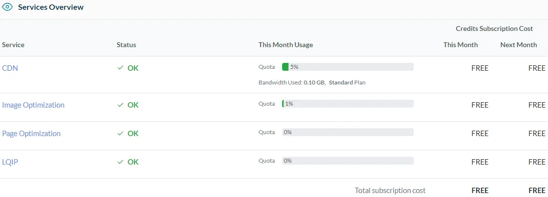 这里的四栏由上至下分别对应的服务是:CDN(内容分发网络),图像优化(即图像压缩等功能),页面优化(UCSS生成等),低质量预览图(在开启图片懒加载时先用一张质量极低但大小极小的缩略图显示给访客)