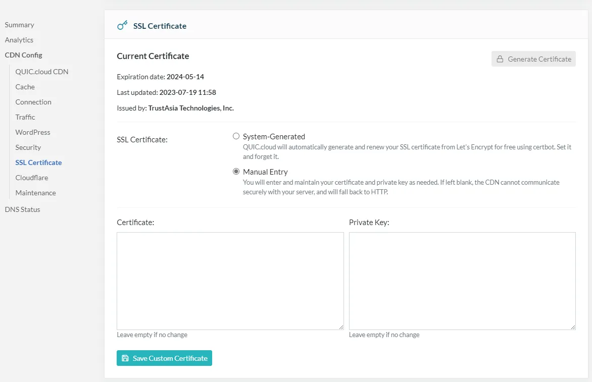 输入完成后点击蓝色按钮”Save Custom Certificate“即可保存证书配置