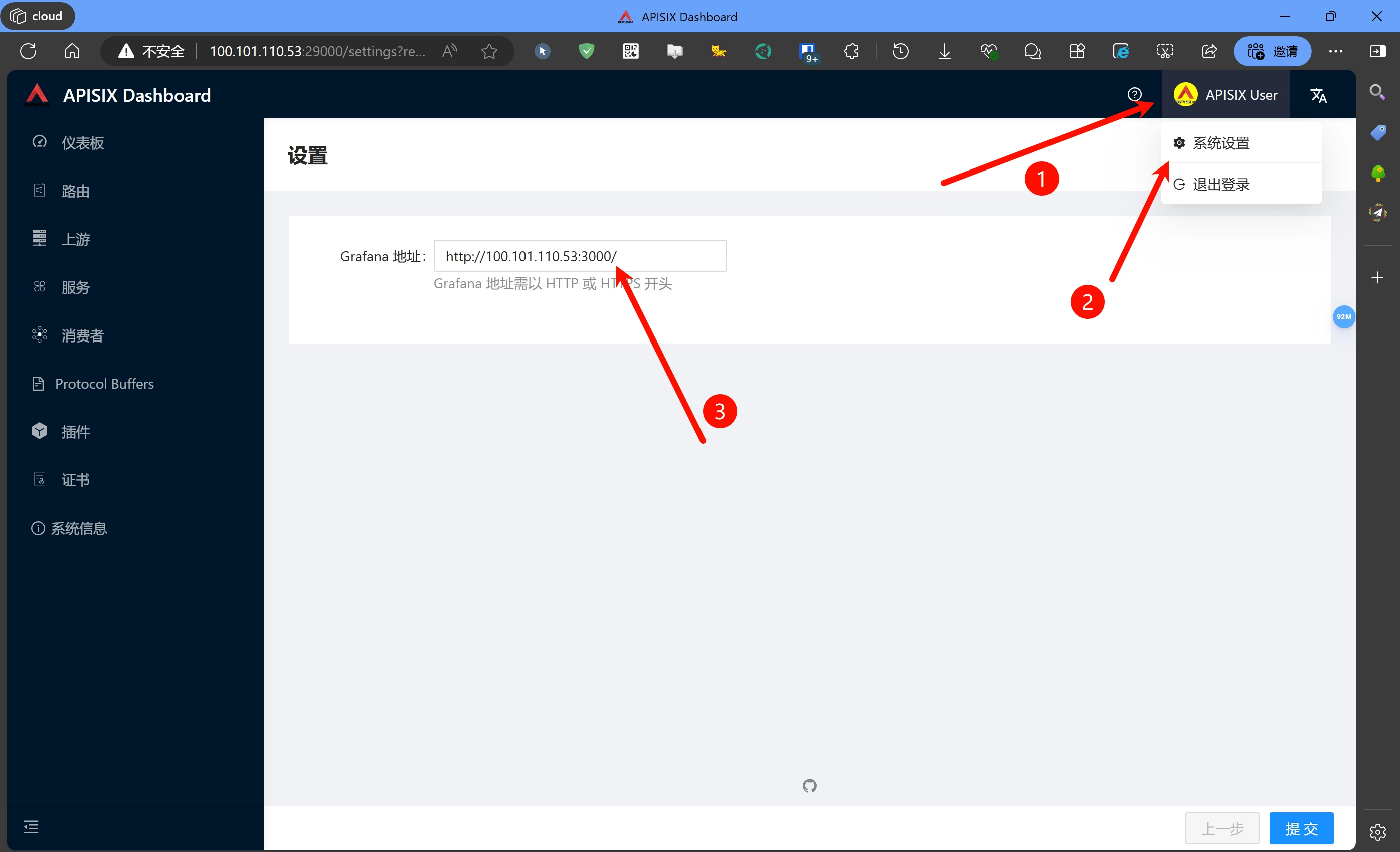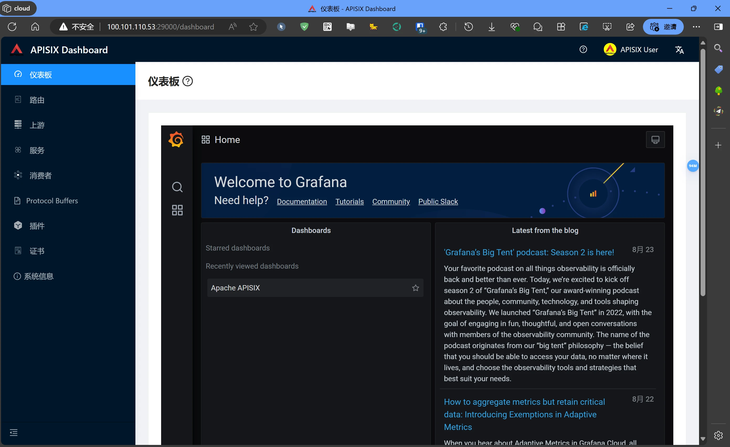 登陆完成会跳到仪表盘页面,如果提示Grafana没配置,可以在这里配置一下: