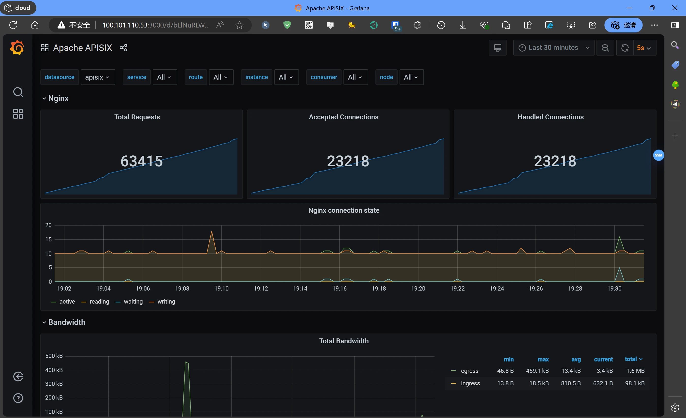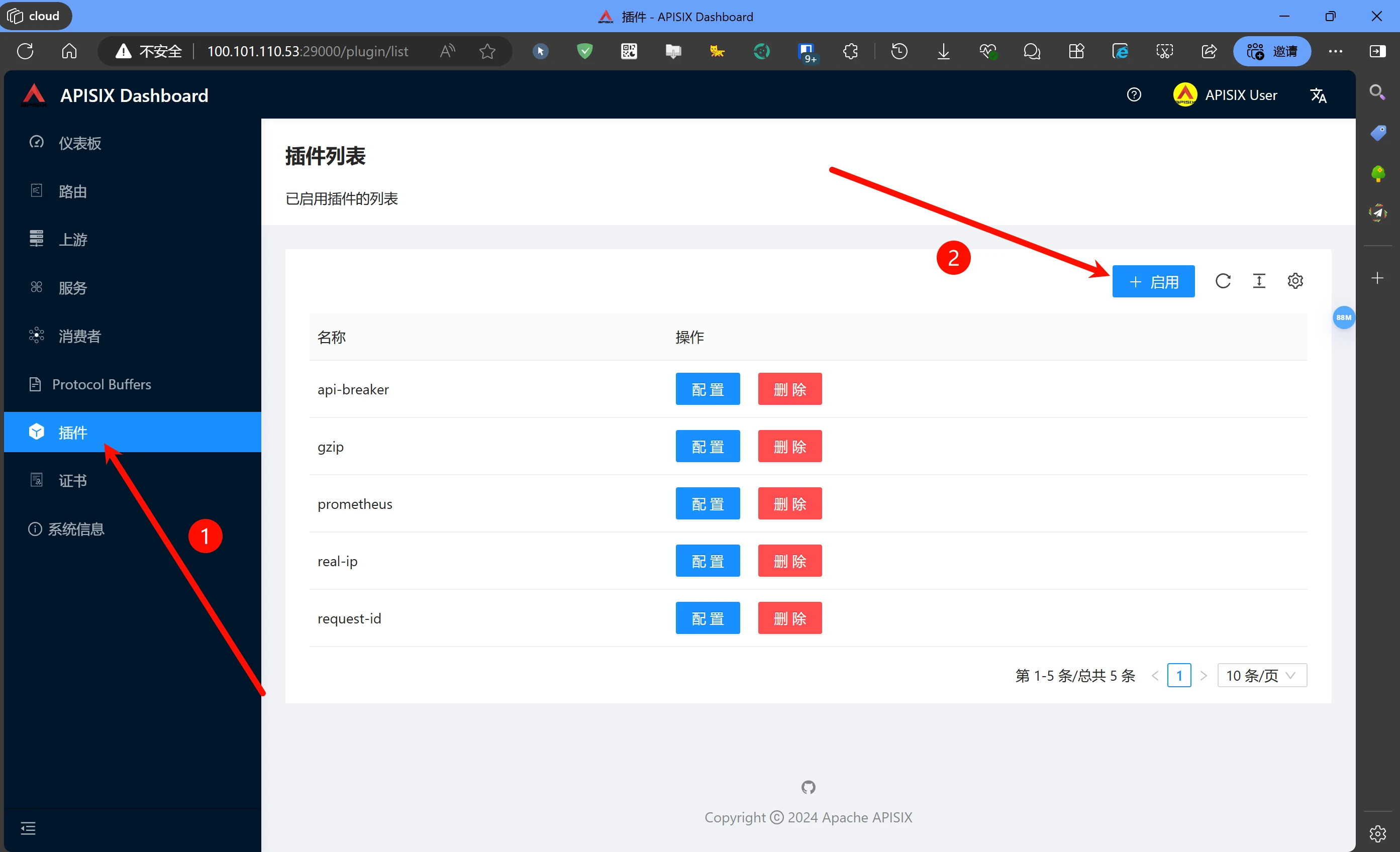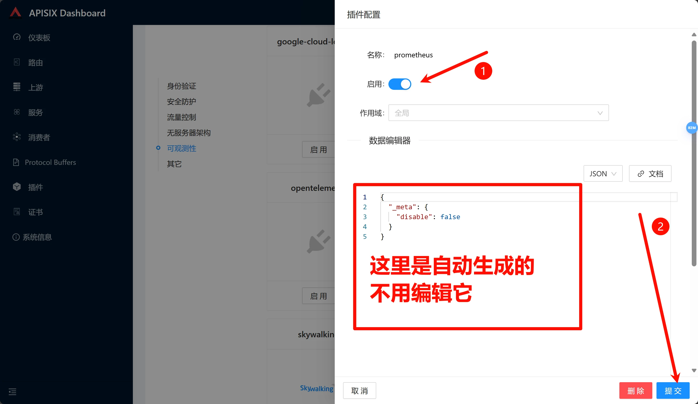 但是默认情况下这些都是没数据的,只有Nginx有监控数据,Apisix的监控数据是传不过来的,那么怎么解决这个问题呢?我们回到Apisix的web管理页面,按照如下步骤添加一个插件
