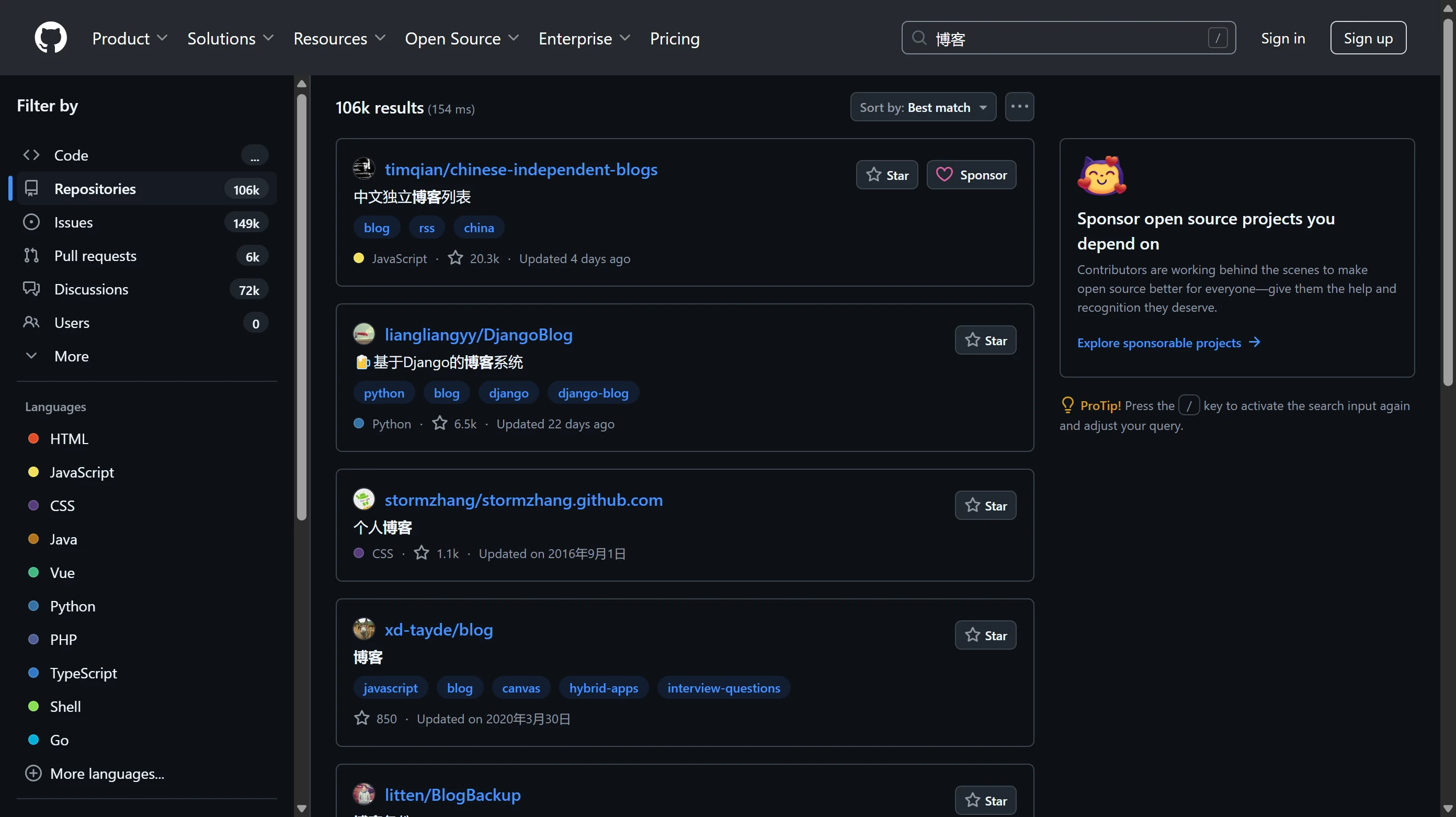 比如我想寻找一个博客源码,那么就直接搜索“博客”
