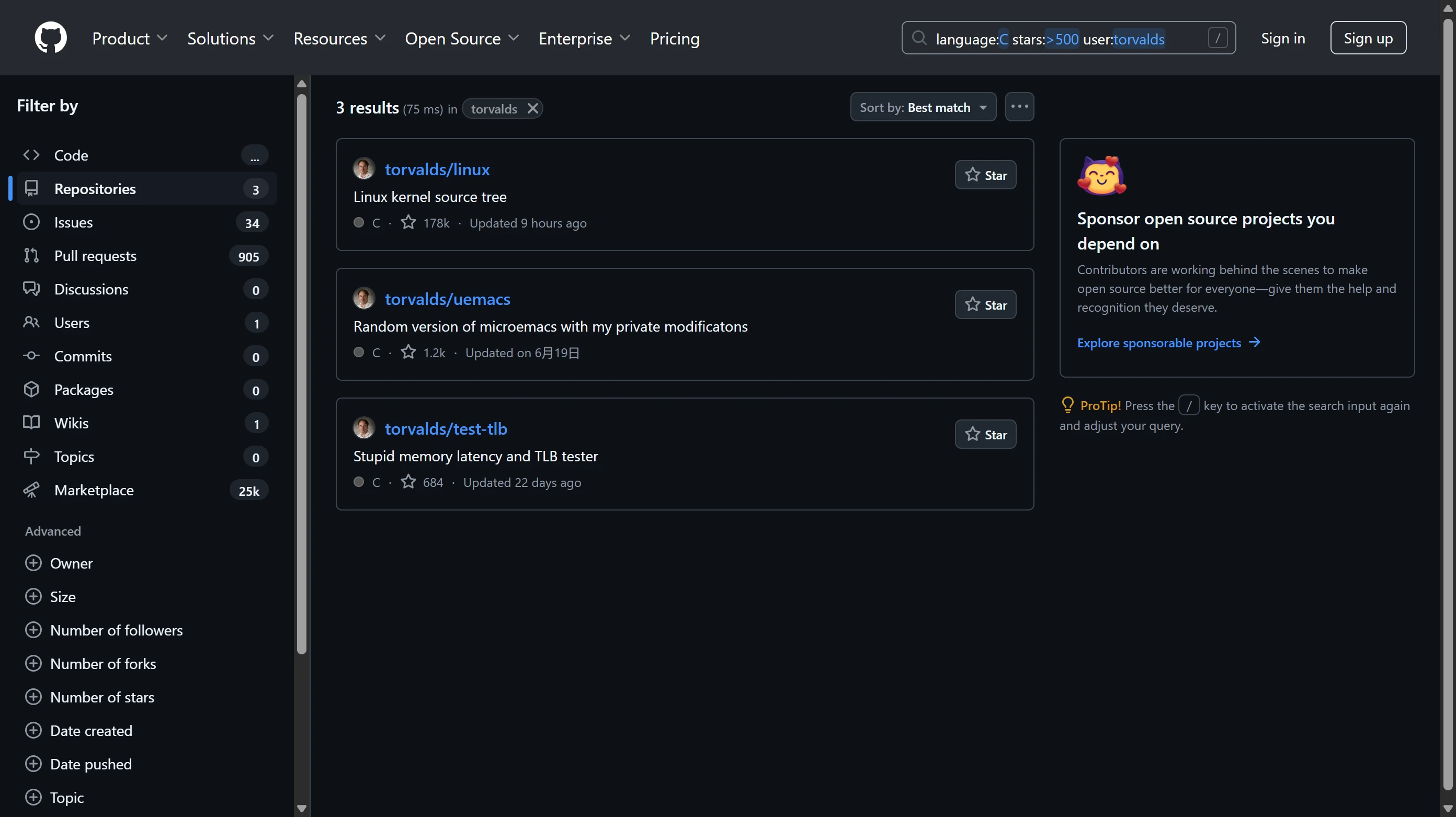而最后的user则是限制指定用户,例如这里只搜索Linus Torvalds所创建的存储库,那么我们就需要根据用户名来进行过滤