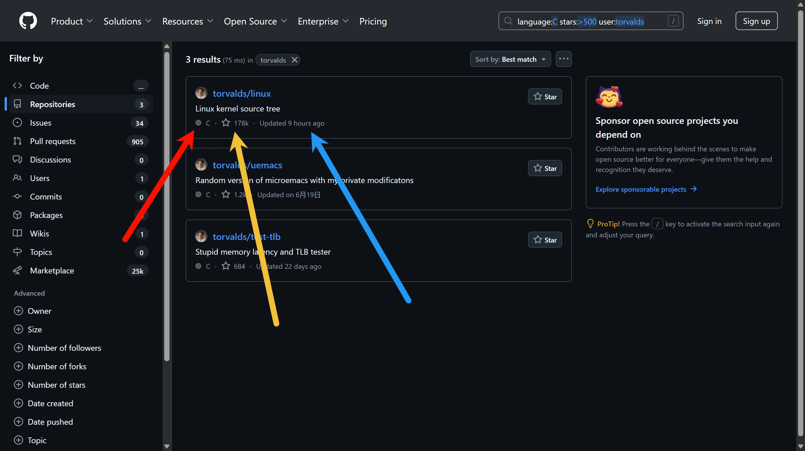 黄色箭头所指的是Star数量,可以认为是收藏数量,可以看到三个都是大于500的,因为我们限制了stars:>500,也就是收藏大于500的存储库