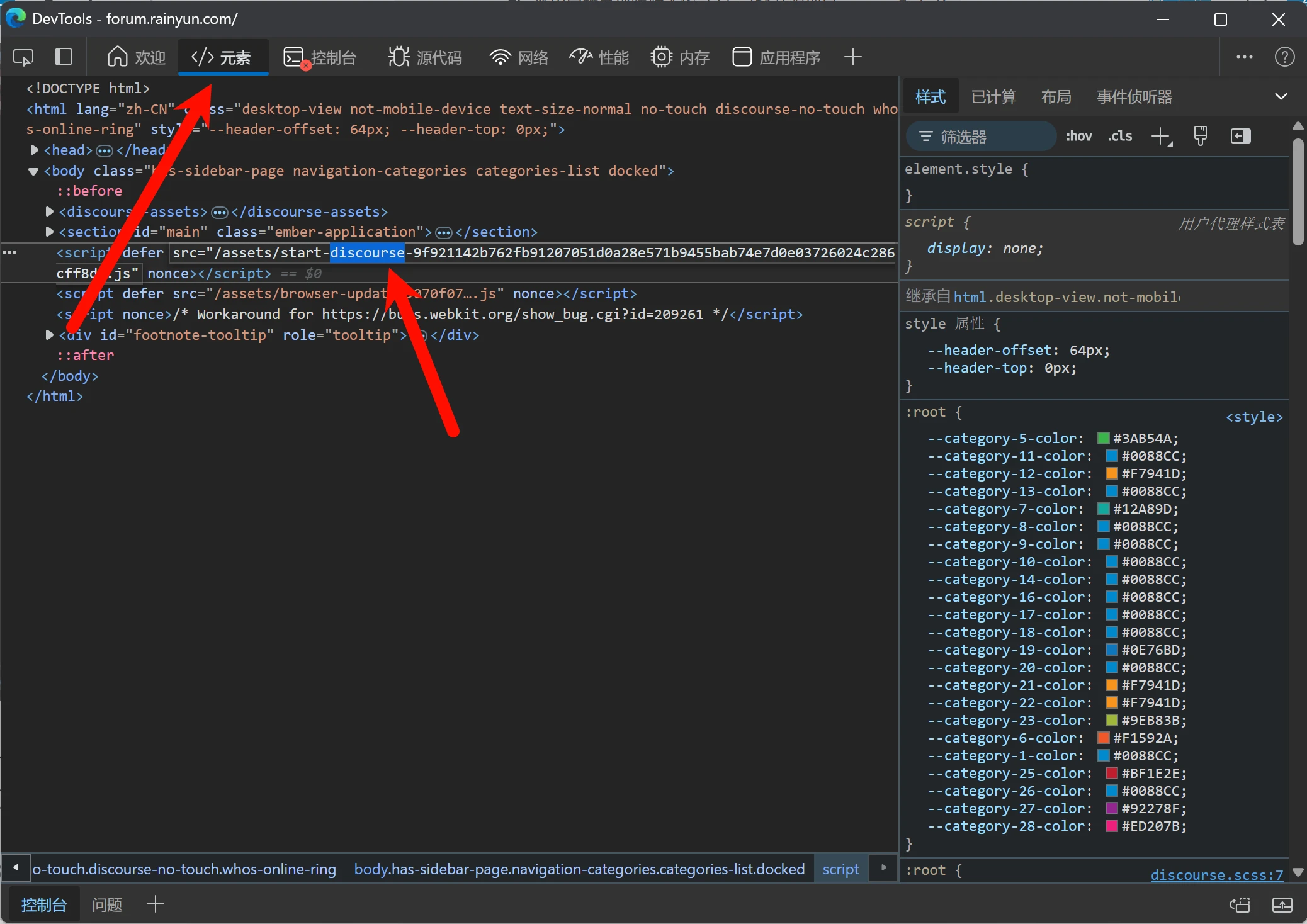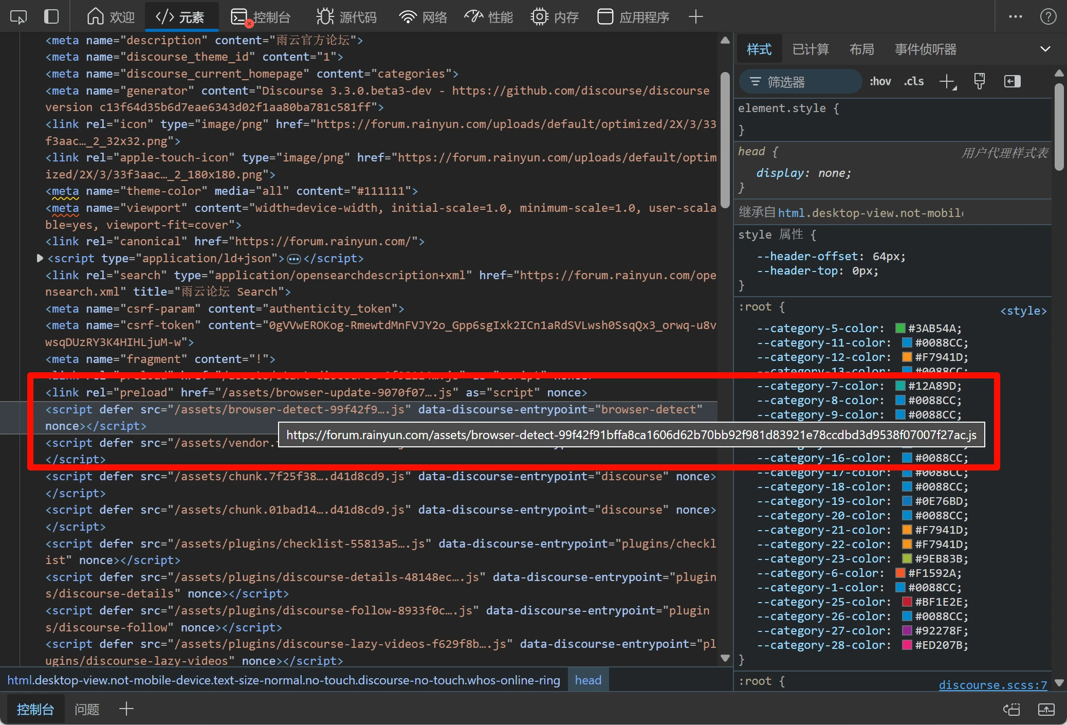 如果没有控制台提示怎么办呢,这时我们需要打开元素选项,并且尝试从引用的文件中寻找