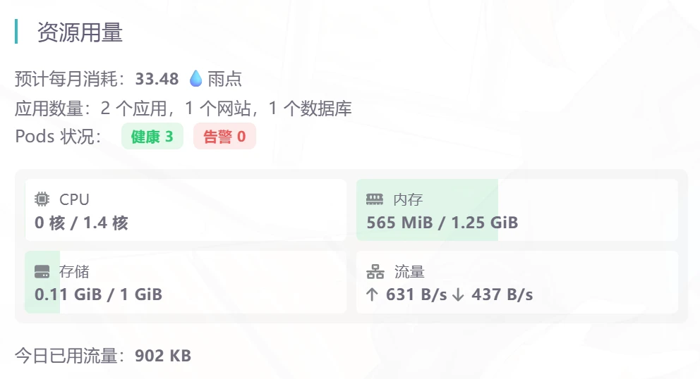 就拿我这台机子来说,CPU负载常年在10%以下,但是又因为其他云厂商性价比高的服务器,通常也只有2-2,2-4,4-8这种比例的配置,服务真正运行起来,甚至CPU只要1个核心就能用,但是内存却吃的比较多,可能需要6G,这时候完全可以使用云应用来降本增效