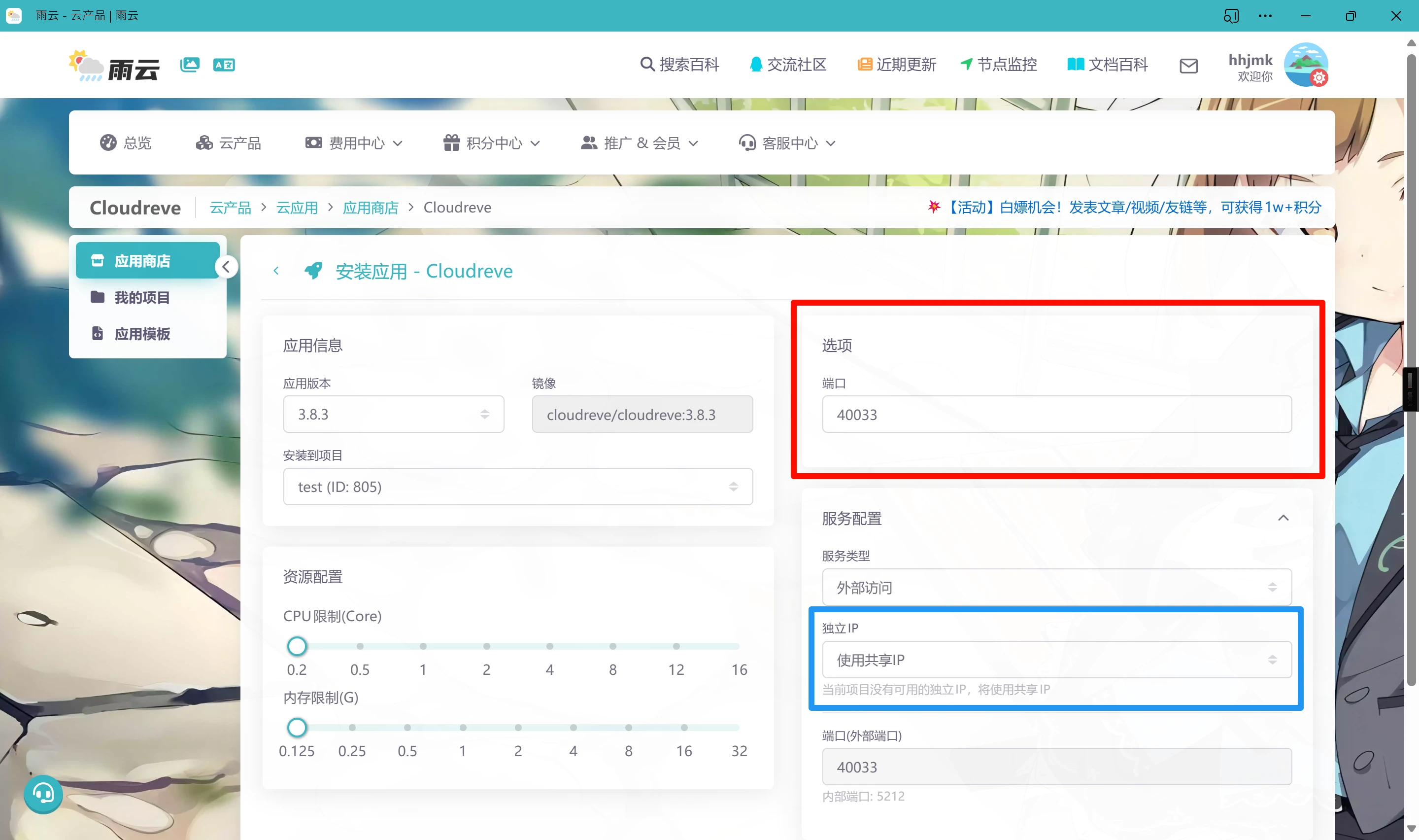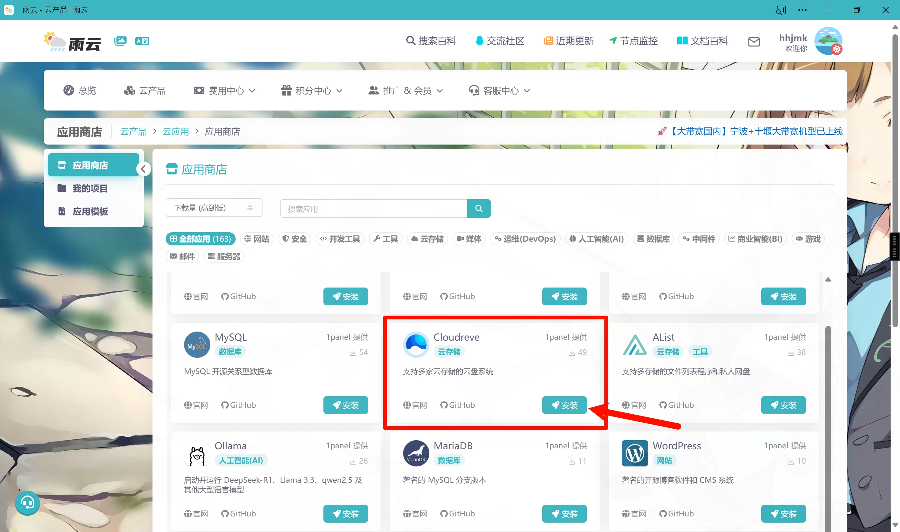 至于接下来的操作,因为它太简单了,随便摸索就能在没有任何云原生/服务器/容器基础的情况下搞明白,我们以安装cloudreve网盘程序为例,看看装一个到底有多简单