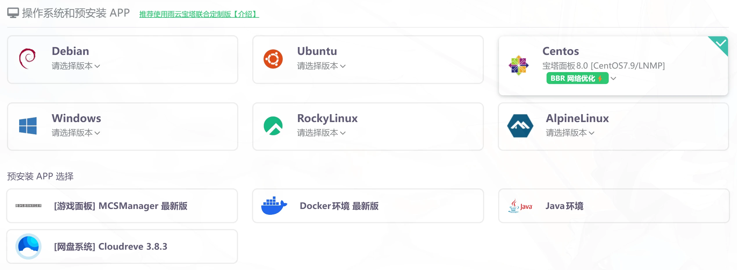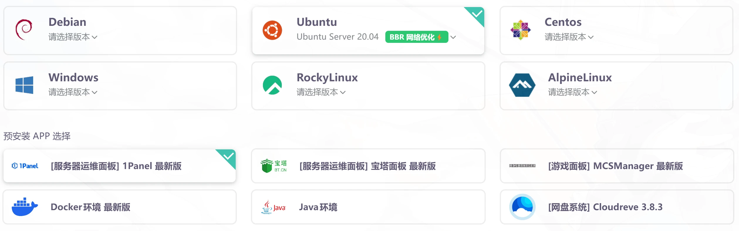 小白建议选择预装APP,在1Panel和宝塔面板之间选一个就好,新手更推荐宝塔面板,因为1Panel涉及到容器化,同时也需要更多的修改才能舒服的使用,两个面板各有优缺点,1Panel官方不守承诺,为了热度无视自己定下的开源规则,宝塔面板则是泄露服务器信息,上报IP等,如果你希望学习到更多的东西或者不喜欢这些面板,可以取消选择预装APP,在服务器开机完成后自己安装环境,推荐使用LNMP(LNMP一键安装包)
