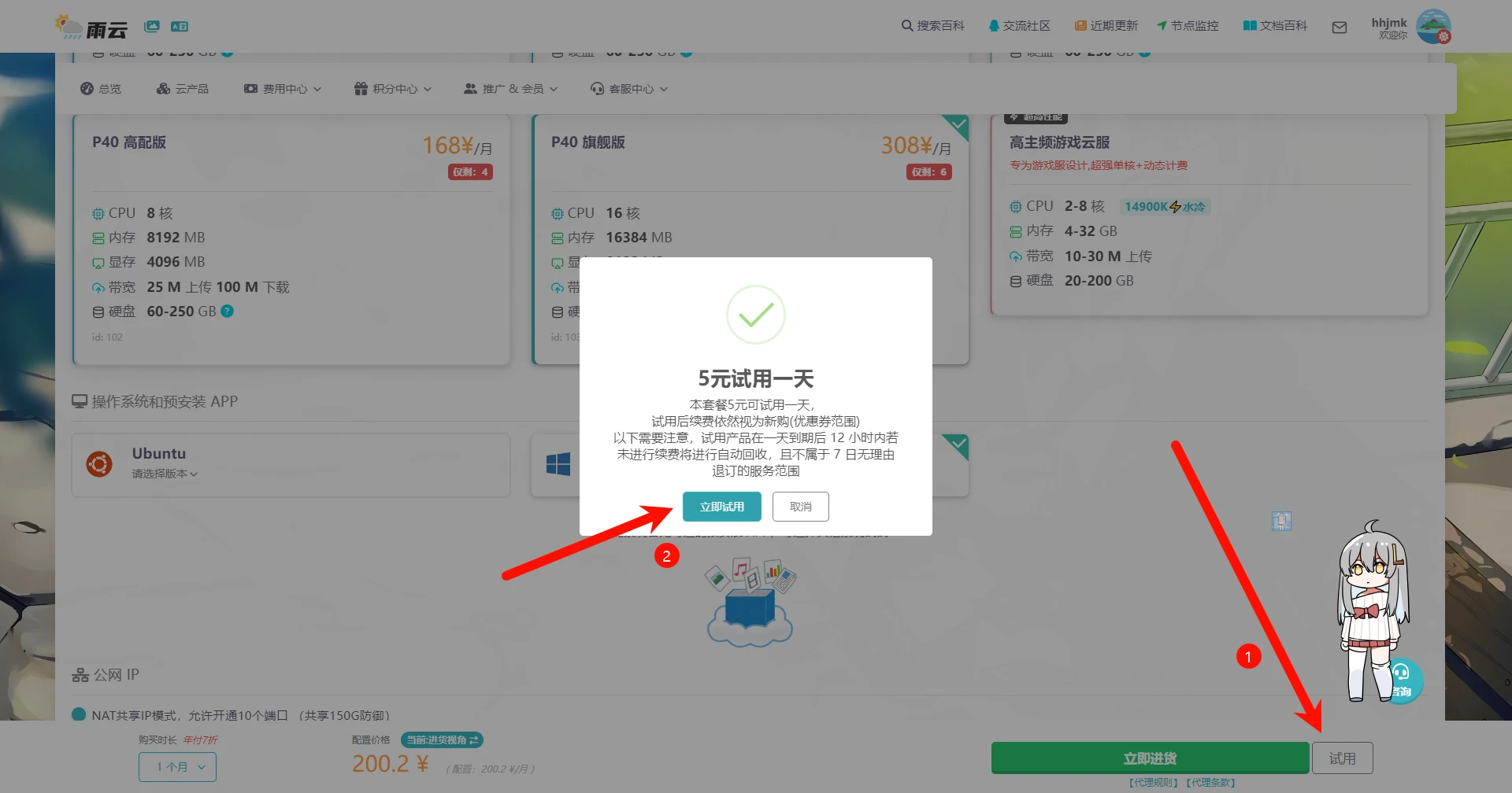 之后点击右下角的试用即可5元获得一天的使用时长