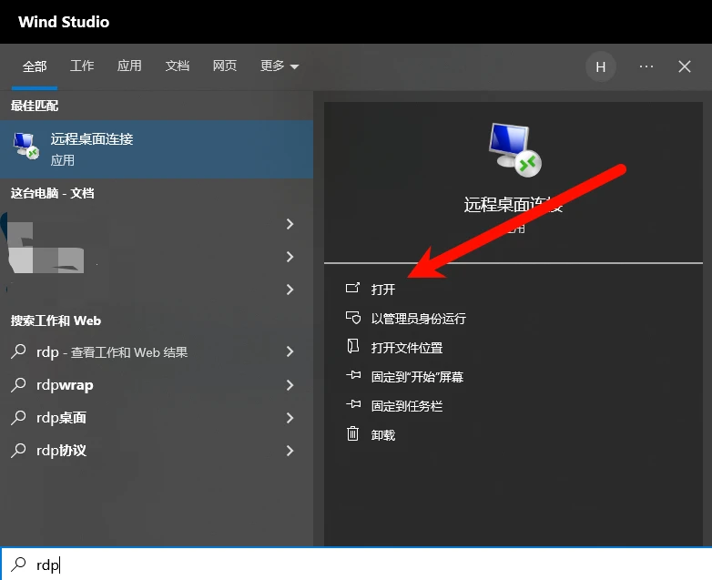 之后在你自己的电脑上搜索rdp,找到远程桌面连接并打开