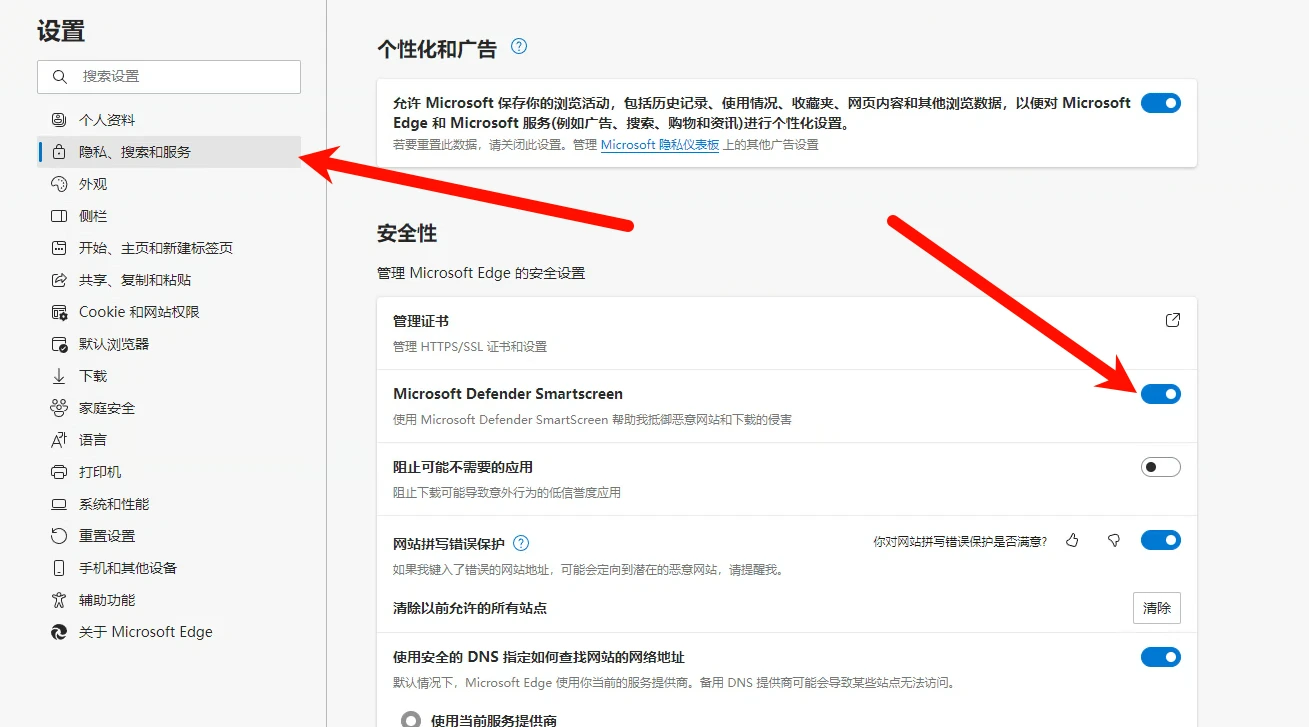 打开edge的设置-隐私、搜索和服务