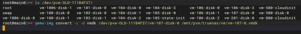 qemu-img convert -c -O vmdk /dev/pve-OLD-111B4F37/vm-107-disk-0 /mnt/pve/truenas/vm/vm-107-0.vmdk