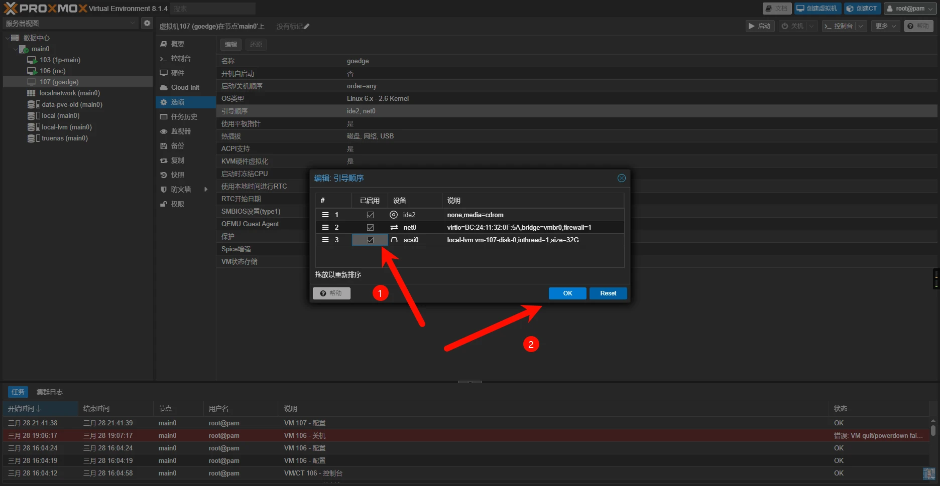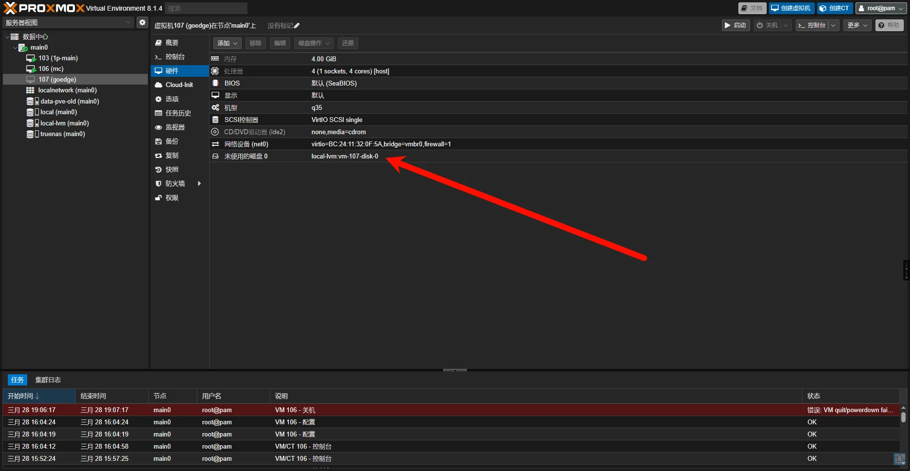 那么这时候就可以想办法导入了,我的想法是先创建一个虚拟机,再用 qm importdisk 命令把磁盘导入到新的虚拟机中