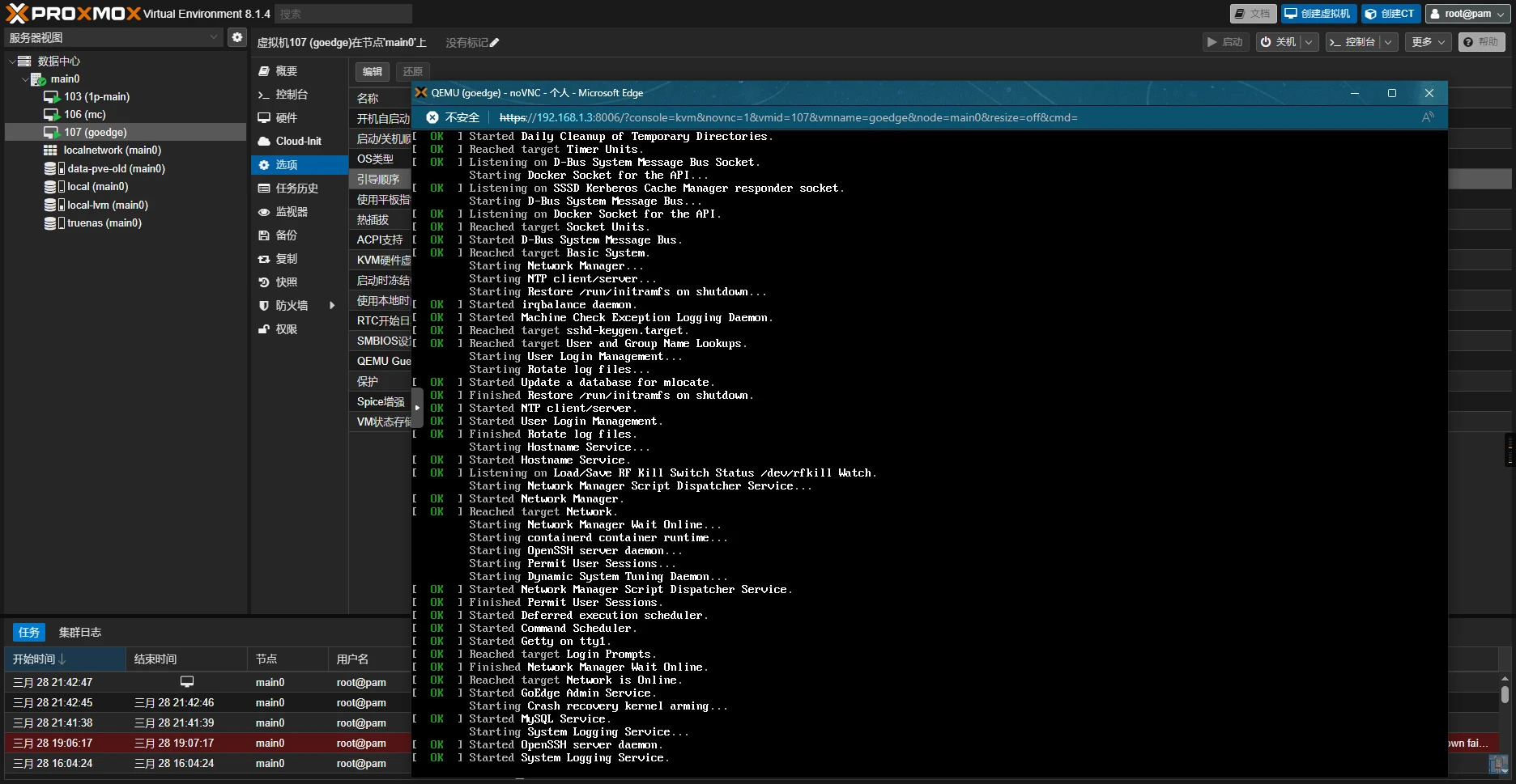 起因是因为我在对虚拟机进行日常备份工作,但是 PVE 在备份完第二个虚拟机后居然卡死了,我先后尝试刷新 WebUI,连接 SSH 均无反应,之后我就按了一下电源键希望它走正常关机流程关机,但是无论按多少次 PVE 都不理我,反而在尝试自己把自己再开起来,这就出现了可以在网络中看到一个奇怪现象