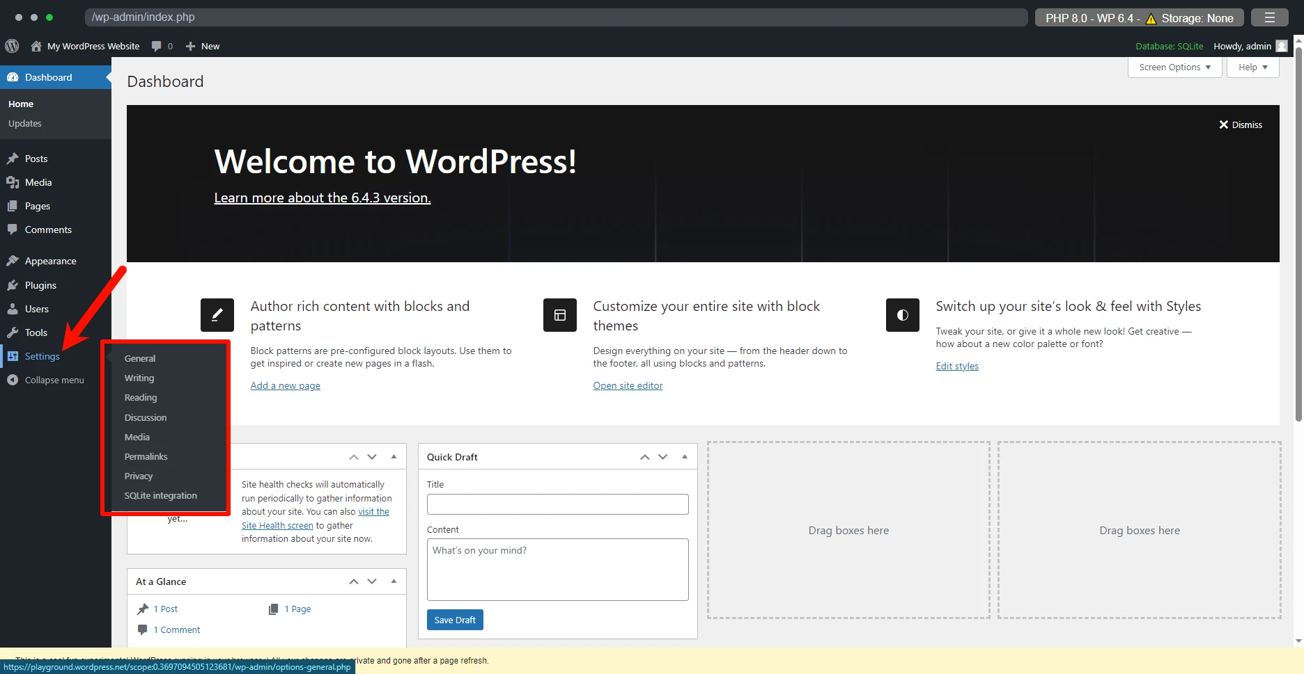 - 您的主页显示:本站后台截图中的此选项被主题修改了,正常的内容应该是上方的英文页面(Playground 环境);在这个选项中你可以将你的 WordPress 首页设置为某个静态页面而不是最新文章,这与之前提到的:站点地址(URL)选项略有不同,站点地址(URL)不能隐藏页面的真实 URL,但此选项可以(当访问 example.com/ 时,返回的内容实际上是 example.com/home/ 页面的内容)