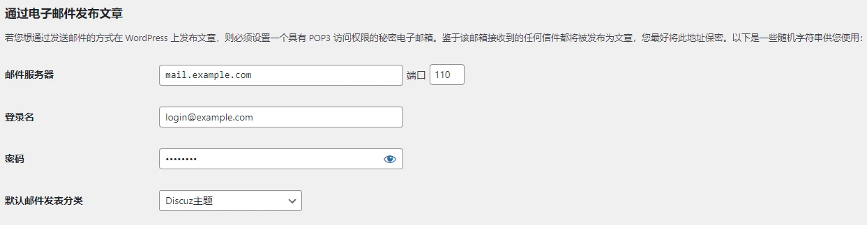 通过邮件发布文章,此功能并不常用,并且 WordPress 官方的开发人员也认为此功能过于落后,将在更新的版本中计划删除此功能,因此,如果有此需求,建议使用 Postie 插件。