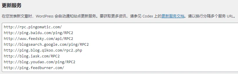 更新服务可以在你发布文章后由 WordPress 自动进行 ping 操作,这可以通知这些站点你发布了新的文章,某种意义上有利于 SEO