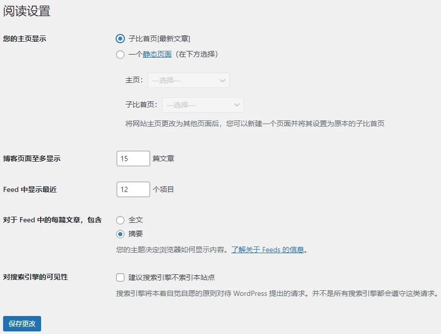 - Feed 中显示最近:Feed 是一种订阅,它可以将你网站最新的 n 个文章标题和摘要(或完整内容,取决于设置)整合进一个特定格式的文件中,并且使用 RSS 阅读器可以将多个站点的 Feed 内容整合在一起,这样只需使用阅读器即可快速浏览多个订阅的站点是否有内容更新