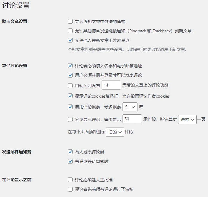 - 默认文章形式:创建文章时,此文章应该为哪种格式,默认为标准(不建议修改,除非有特殊需要)